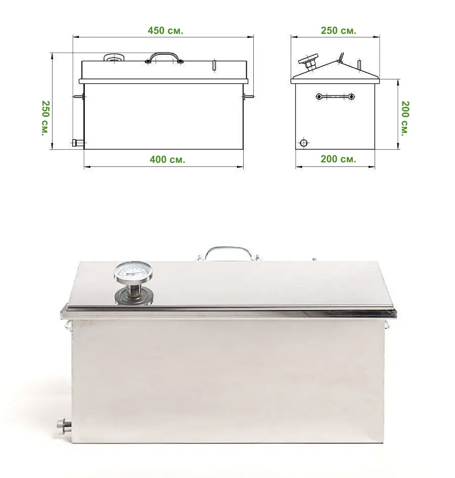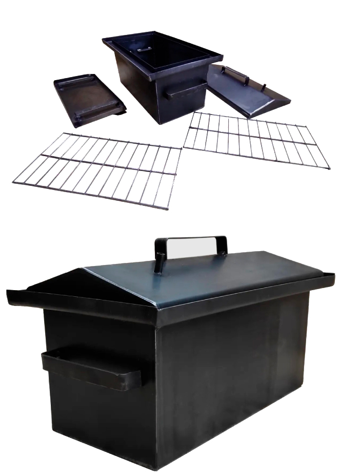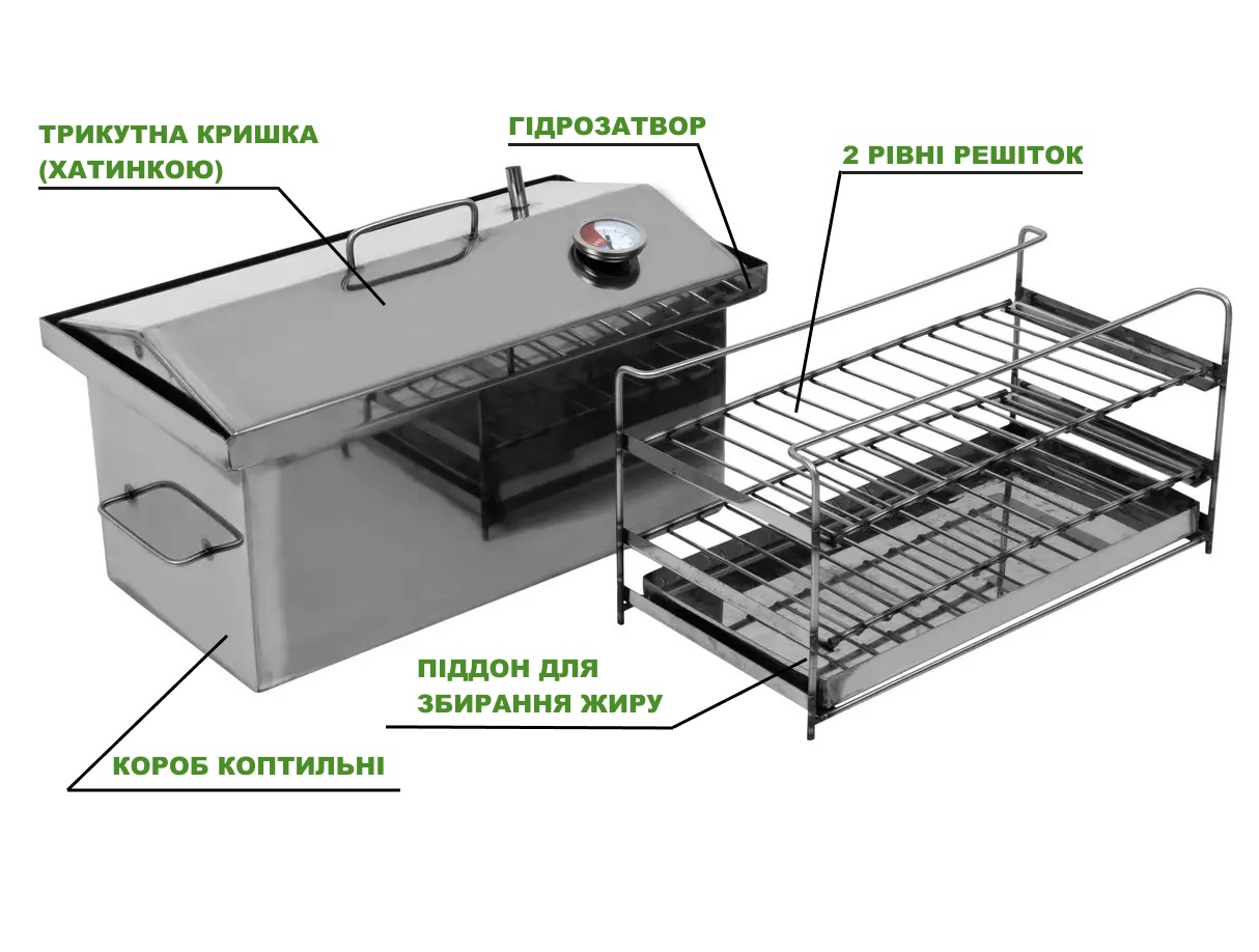 Коптильня виготовлена з якісних матеріалів, вона забезпечує надійність і довговічність використання. Коптильня дозволяє коптити різноманітні продукти, включаючи м'ясо, рибу, овочі, сир і багато іншого.